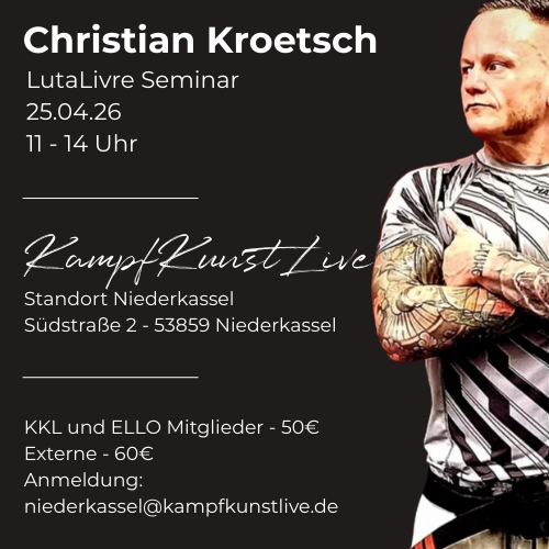 KampfKunstLive Niederkassel Südstraße 2, Niederkassel, DeutschlandChristian Kroetsch alias @kroetschzilla bei KampfKunstLive Am 25.04. begrüßen wir Christian in unserem Standort in Niederkassel. Uhrzeit: 11.00 - 14.00 Uhr Kosten: KKL Mitglieder - 50 € Externe Teilnehmer - […]
